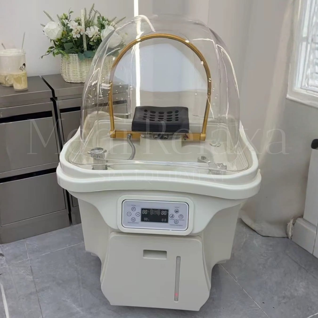 De mobiele headspa heeft een capaciteit van 60 liter. Omdat de waterboog circulatie gebruikt, kan je tot wel 5 headspa behandelingen doen met één watertank.